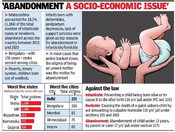MUMBAI: Delhi recorded the highest number of infants abandoned in any Indian city between 2015 and 2020, according to the National Crime Records Bureau’s 2020 report. Among states, Maharashtra saw the highest number of abandoned babies, foeticides and infanticides combined across the country within the same period, accounting for 18.3% of the national tally of 6,459.
