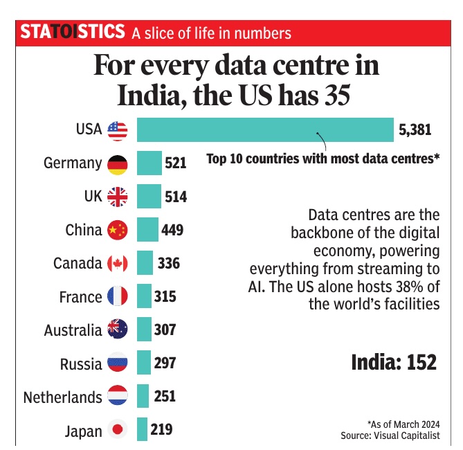 Data centres in India vis-à-vis Canada, China, France, Germany. Japan, Netherlands, Russia, S. Korea, the UK and the USA.