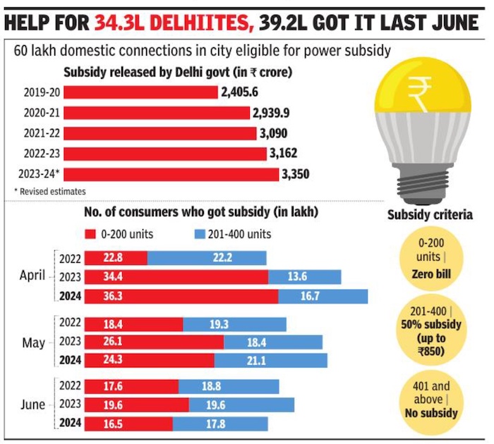 The CSE analysis has found that the subsidised 400 units can easily accommodate use of one AC, lights, fans and other appliances. “If a 3-star split AC runs for six hours a day for 30 days in a month, it will consume about 260 kWh of electricity, which can be easily covered under the subsidised 400 units a month. Delhi government data shows that the subsidy was availed by 82% of homes last year — which means even higher income households are benefitting from the low rates, since there is no mandate for energy audits or compulsory disclosure of annual energy consumption,” says the analysis.