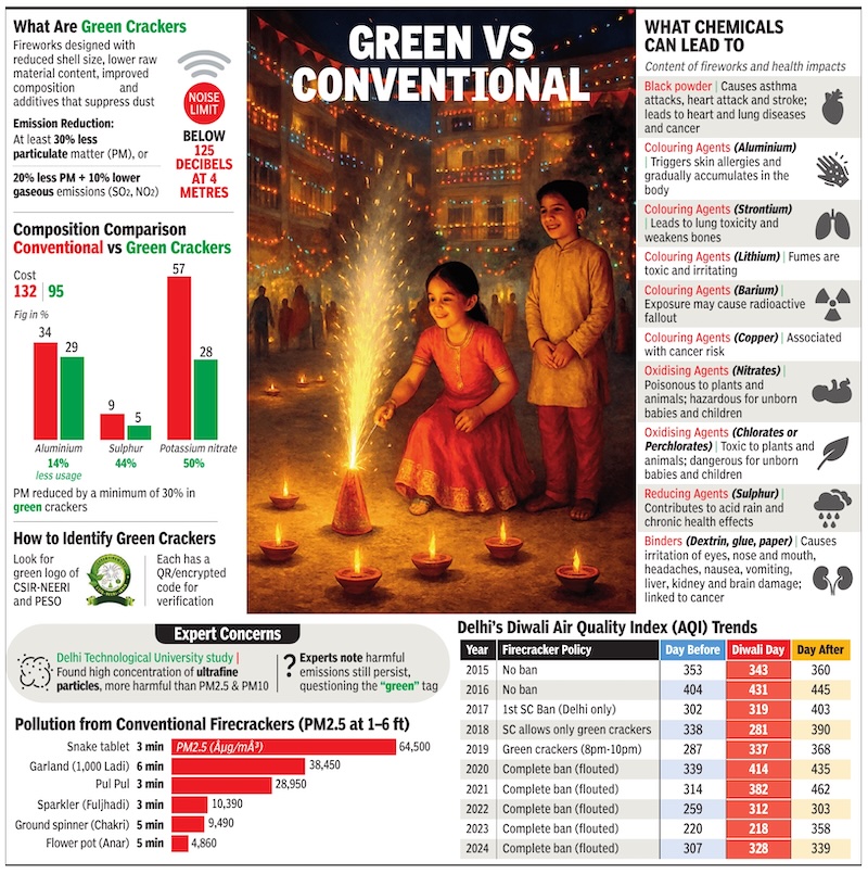 The Supreme Court in its order insisted that only ‘Green Crackers’ and ‘improved crackers’ be used. CSIR’s Green Crackers should lead to a 30-35% reduction in particulate matter and a significant decline in hazardous nitrous oxide and sulphur dioxide.