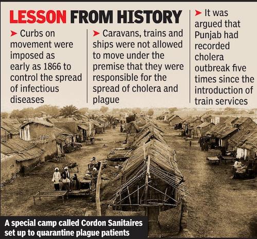 British India official records in the National Archives of India (NAI), New Delhi, and British India medical history archival data reveal that British and Nizam governments had suggested a lockdown as trains and caravans were considered as carriers of infectious diseases, particularly cholera. There was no nationwide lockdown, but curbs on travel and movement of passenger and transport vehicles including ships were imposed in parts of British India.