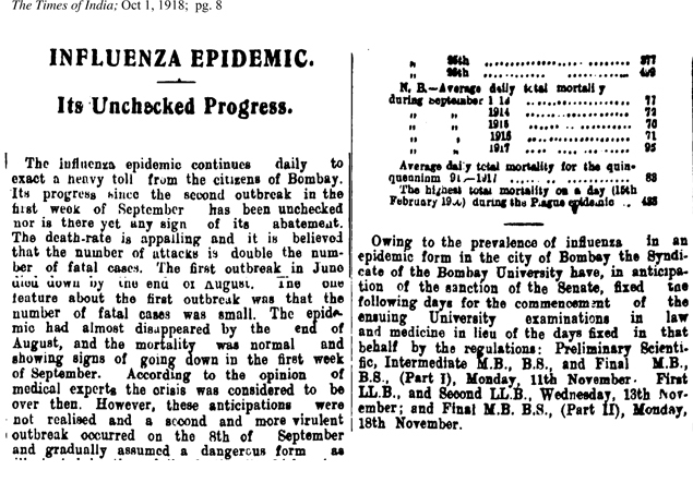 A Times of India story from October 1, 1918 talking about the influence the epidemic had “It happened in the shadow of World War I when there was a lot of movement of troops. At that time the incubation period was just one or two days. People were infecting each other rapidly and the mortality rate was high,” says Dr Lalit Kant, independent public health consultant and formerly with the Indian Council for Medical Research.