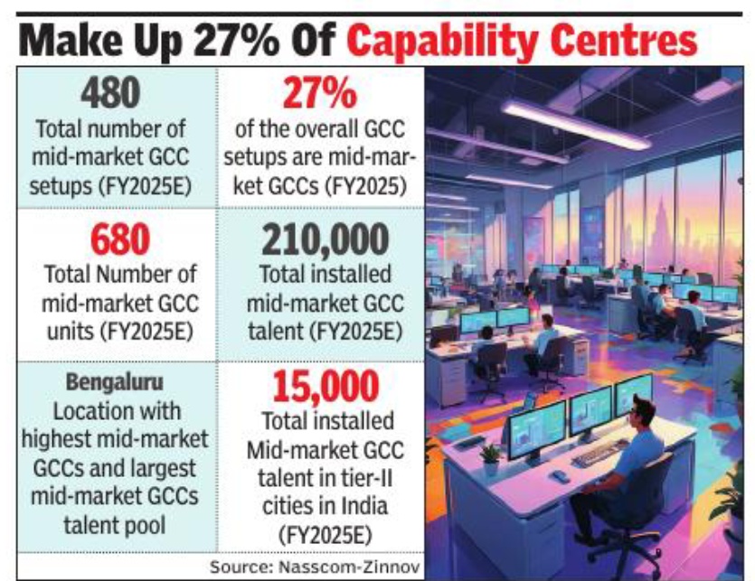 Hyderabad : India’s midmarket GCCs (global capability centres) are experiencing a surge, outshining their peers by unlocking new opportunities. This growth is creating a flywheel effect, allowing them to leverage a diverse talent pool. India has over 480 midmarket GCCs, with 2.1 lakh employees, as shown in a Nasscom-Zinnov report.