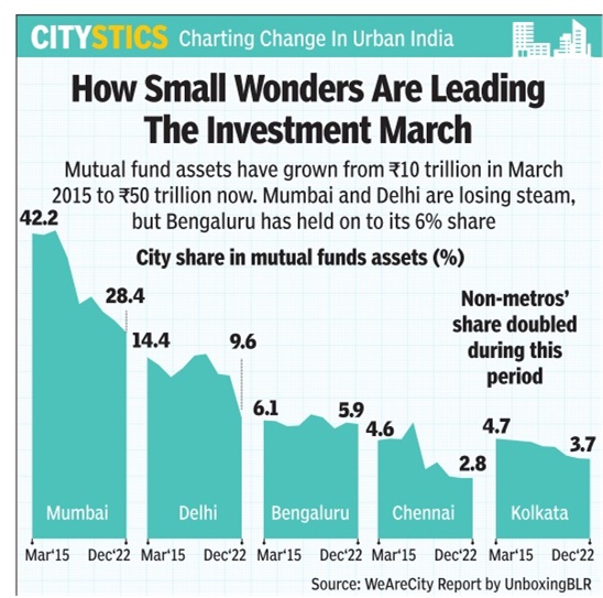 As Indian investors seek higher returns than those from bank fixed deposits (FDs), smaller cities are leading the rush towards MF investments. Money invested in MFs (called assets under management, or AUM) now amounts to roughly a fifth of savings in FDs, which is an all-time high. At the same time, growth in bank deposits has never been slower since 1963.