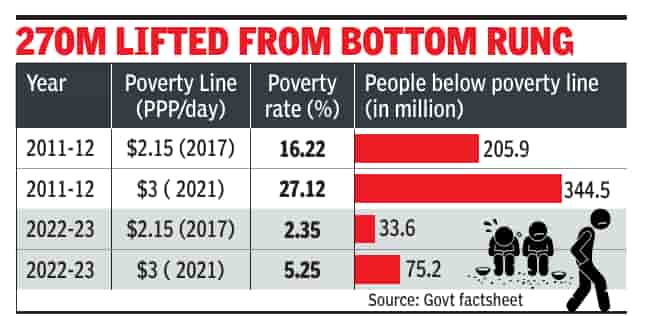 Based on the update, latest WB data showed the extreme poverty rate had declined from 27.1% in 2011-12 to 5.3% in 2022-23. The number of people living in extreme poverty also fell sharply during this period from 344.47 million in 2011-12 to 75.24 million in 2022-23. This would mean nearly 270 million were lifted out of extreme poverty during this period. In a blog, WB said the international poverty line for low-income countries has been raised to $3 per person per day from the existing $2.15 per person per day; for lower middle-income countries, it’s changed from $3.65 to $4.20 per day; and for upper middle-income countries it went up from $6.85 to $8.40.