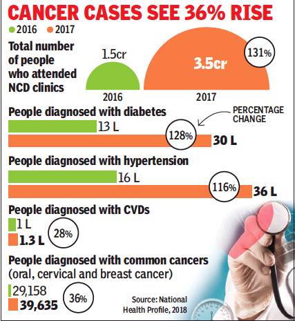 Data from the massive screening exercise, used by the National Health Profile (NHP), 2018, showed incidence of diabetes increasing by 128% to more than 30 lakh cases during 2017, as compared 13.2 lakh diagnosed in 2016. Similarly, the number of persons diagnosed with hypertension increased from 16.9 lakh in 2016 to 36.5 lakh in 2017, a jump of nearly 116%.
