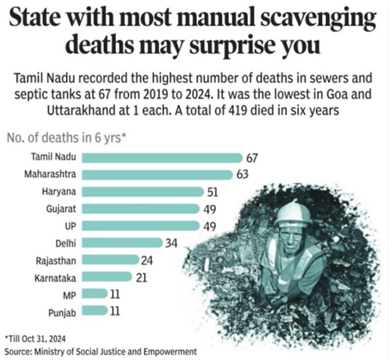 The Centre informed Rajya Sabha that while there are no reports of death due to manual scavenging, data shared by states shows that the number of deaths related to cleaning of sewers and septic tanks is 941 since 1993. The maximum number of cases are from Tamil Nadu (213) followed by Gujarat (153) and UP (104). The national capital has reported 98 cases.