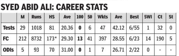 Old timers aver that Abid Ali was so versatile that he could open the bowling, batting, was an excellent fielder and he could also keep wickets — a prototype cricketer of the limited-overs game that belonged in the far future. He actually started as a wicketkeeper. He aggregated 8732 runs in 212 first-class matches with 13 centuries and claimed 397 wickets with 14 fifers.
