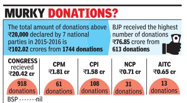Political parties rely heavi y on donations for contesting elections and running their daily affairs. They receive huge sums of money in the form of donations from corporates or business houses, trusts and individuals. Section 29C of the Representation of the People Act, 1951, mandates that political parties submit their contribution details in excess of Rs 20,000 received from any person or a company to the Election Commission of India annually , in order to enjoy 100% tax exemption, which has been analysed by Association for Democratic Reforms (ADR) With 1,234 donations from individuals and corporates, BJP tops the list and has declared a total of Rs 437.35 crore as received via voluntary contributions of above Rs 20,000.The donations declared by BJP are more than twice the contributions declared by Congress, NCP, CPI and CPM in the same period.