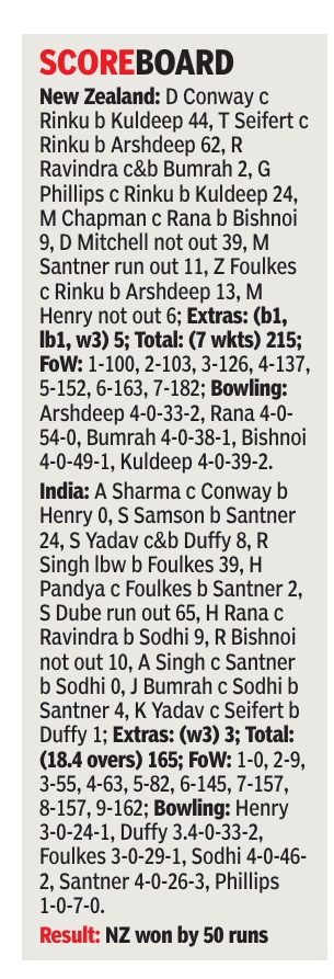 Playing with a batter less — Ishan Kishan was out with a niggle — India were set a challenging target of 216 by the Kiwis. However, the hosts lost wickets at regular intervals to be all out for 165 in 18.4 overs.