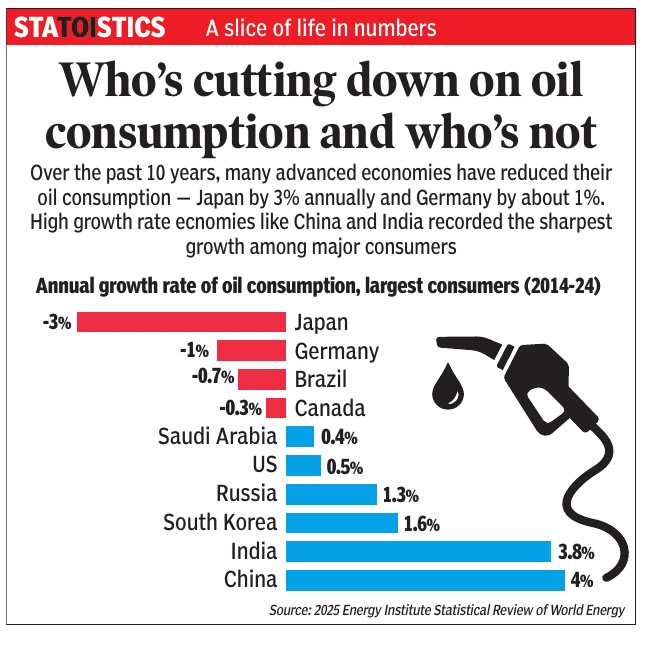 Increases or decreases in oil consumption in India, Brazil, Canada, China, Germany, Japan, Russia, S. Korea and the USA. 2025