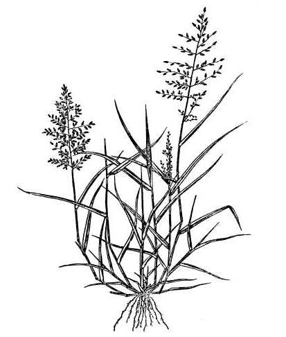 The panicle is erect, narrow, contracted, with branches in pseudo-whorls and varying in length from 6 to 18 inches, branches are slender, filiform, two or more arising from the same level, 1 to 3 inches long.