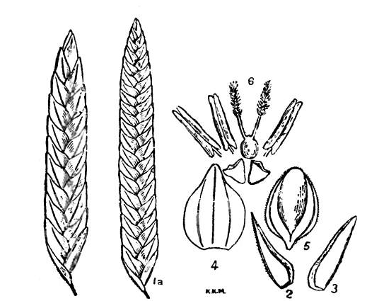 The spikelets are ovate or ovoid to oblong, much compressed, usually 15- to 20-flowered and up to 40 and then linear, 1/4 to 2/3 inch long, spreading, green or olive grey. The empty glumes are one-nerved and keeled. The first glume is longer than the second glume, very acute or acuminate. The second glume is smaller than the first, with stout rounded keel. The flowering glumes are as long or slightly shorter than the first glume, broadly ovate, sub-acuminate, with faint nerves and paleate; palea is shorter than its glume and with ciliate wings to the keel. Stamens are three. Grain is free.