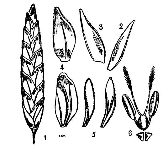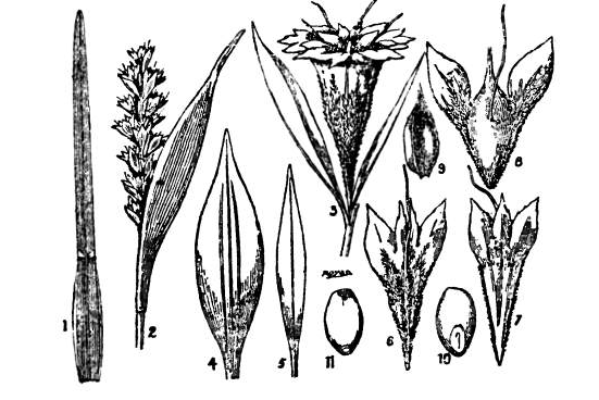 The fourth and the subsequent glumes are imperfect and they get gradually smaller and smaller, the last glume being represented only by a rudimentary glume with three awns. Lodicules are dolabriform and two. Stamens are three. Styles are free. Grain is obovoid or oblong, free.