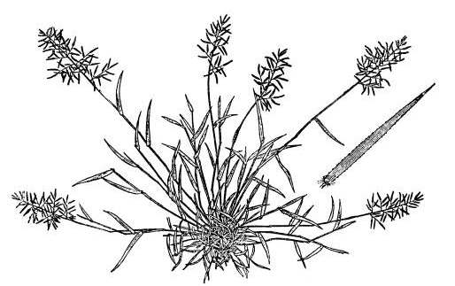 This is a very small densely tufted annual grass, never exceeding 3 inches in height and with compressed slender, tough stems.