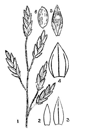 There are 6 or 7 glumes in the spikelet. The first glume is lanceolate, acute, softly hairy, usually 9-nerved, or varying from 7 to 12 (some nerves do not reach the apex), about 1/4 inch long. The second glume is similar to the first but a little longer and both the glumes have broad hyaline margins.