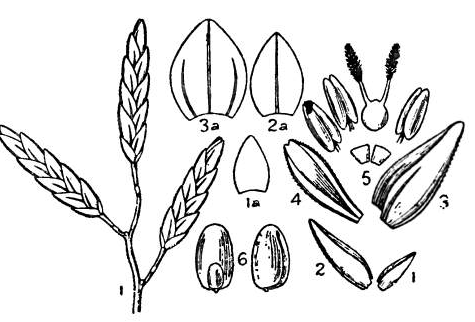 The flowering glumes are broadly ovate, oblique, obtuse, sometimes with a minute mucro, sub-chartaceous, punctulate, strongly three-nerved, paleate, about 1/12 inch long; palea is shorter than the glume, curved, obovate-oblong, keels ciliolate and persistent. Stamens are three with very small pale yellow anthers. Stigmas are two and white. Lodicules are very small. Grain is globose reddish brown, minutely and obscurely lineolate.