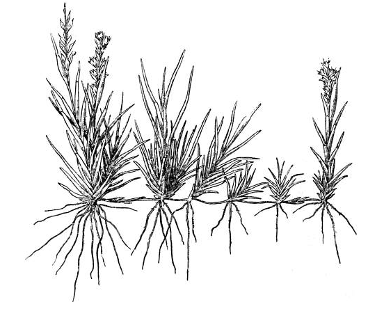 This is a tall perennial grass freely branching from the base and with stout stolons covered with shining sheaths. The root-stock is stout and creeping. The stems are tufted, smooth, erect, with fascicles of leaves at the base 1 to 3 feet high.