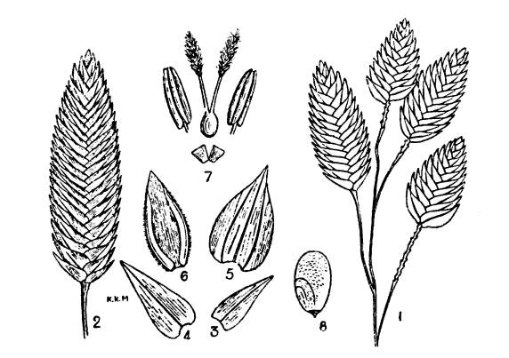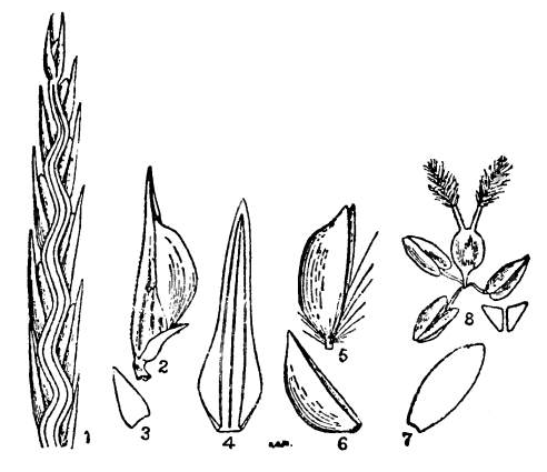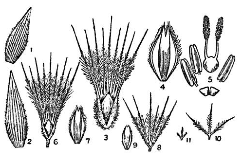 The third and fourth glumes are half-amplexicaul, empty, epaleate, flabelliform, 4-lobed, 7-nerved, shortly awned at [Pg 287]the back, villous; the side lobes are acuminate or aristate and the central lobes are shortly awned. The fifth, sixth and seventh glumes are obovate-cuneate, 7- to 9-nerved, paleate, flower-bearing and 3-lobed, the side lobes are acuminate and the central lobe is bifid and dorsally awned; palea is ovate-acute, 2-nerved and ciliolate. The eighth glume, if present, is neuter and imperfect, 3-lobed and shortly awned. Lodicules are minute. Stamens are two or three with small anthers. Grain is oblong, compressed, reddish brown.