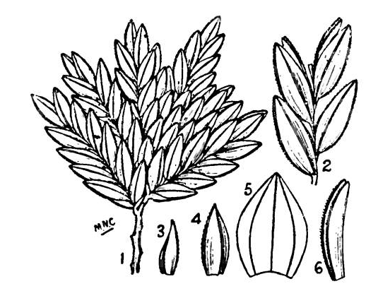 The leaf-blade is flat, linear, distichous, coriaceous, rounded at the tip, margins sparsely ciliate, 1 to 2-1/2 inches long.