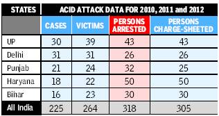 Patriarchal societies such as Uttar Pradesh, Delhi, Punjab and Haryana — with worst sex ratios — account for most number of acid attack victims while the northeastern states, where women play a more decisive role in society, have negligible number of such attacks, government data shows. While a total of 57 cases with 65 victims were recorded in 2010, in 2012, the figure jumped to 85 cases with 101 victims. Delhi, UP, Punjab, Haryana and Bihar together accounted for 53% of all victims. Delhi (31) and UP (39) accounted for 27% of all victims in the country between 2010 and 2012. The data also shows that arrests and prosecution have had no deterring effect, making it a problem of social attitude rather than law and order