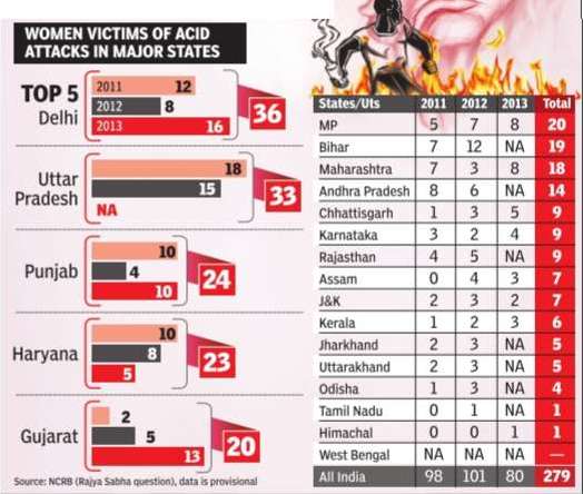 New Delhi: Government data on acid attacks point to patriarchal societies such as UP, Delhi, Punjab and Haryana — among states with worst sex ratios — accounting for most number of victims while those with greater role for women, such as the northeast, having negligible number of such attacks. The data, collected for 2010, 2011 and 2012, assume significance in the light of the December 3 Supreme Court order, directing all states and union territories to frame rules on acid sale by March this year.