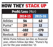 Nike's competitors Adidas and Puma have surged ahead with sales of Rs 899 crore and Rs 878 crore. In FY15, Adidas not hed up sales of Rs 805 crore, while Puma, whose year ended n December 2014, showed sales f Rs 769 crore.