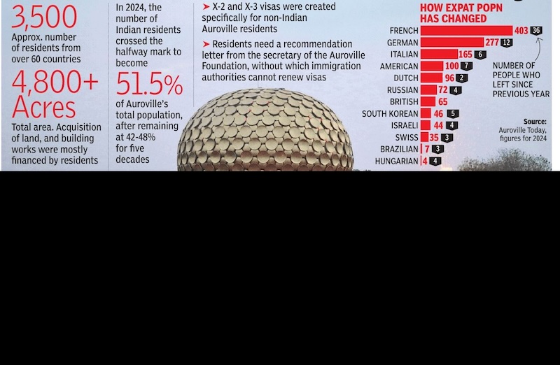 Inaugurated on Feb 28, 1968, Auroville was planned as a city for a maximum of 50,000 residents. Nearly six decades later, it is home to less than a tenth of that number. Small as the community is, its non-Indian population has begun to register an unmissable decline in the last four years. At its peak, Auroville had a population of 3,500 people from 64 nations. But that diversity is wearing thin. Several French, German, Italian and American residents have left, as have Russians, Israelis, South Koreans, and Swiss. The exits underline the irony of its present situation.
