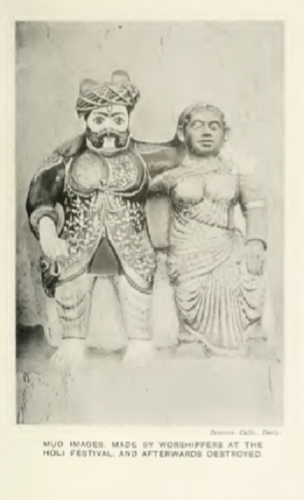 In the month of Phagun (February), about the time of the Holi, the Marwaris make an image of mud naked, calling it Nathu Ram, who was supposed to be a great Marwari. They mock at this and throw mud at it, and beat it with shoes, and have various jests and sports. The men and women are divided into two parties, and throw dirty water and red powder over each other, and the women make whips of cloth and beat the men. After two or three days, they break up the image and throw it away. The Banias, both Jain and Hindu, like to begin the day by going and looking at the god in his temple. This is considered an auspicious omen in the same manner as it is commonly held to be a good omen to see some particular person or class of person the first thing in the morning. Others begin the day by worshipping the sacred tulsi or basil.
