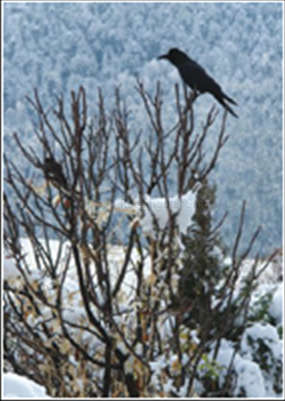 Dry cold, the kind that cracks your lips, turns your hands to sandpaper and your breath to incandescent smoke does, however, have it’s benefits: sharp white mountains are cleanly etched against a brilliant blue sky, icicles reflect myriad fragmented, translucent colours as they shimmer and tinkle in the razor sharp wind, fox paw prints indent blue-white crystalline snow next to a frozen pond where it usually drinks, bird’s of all description pester for nuts, cooked rice grains, currants, bread, anything at all edible and come close enough to be fed by hand.