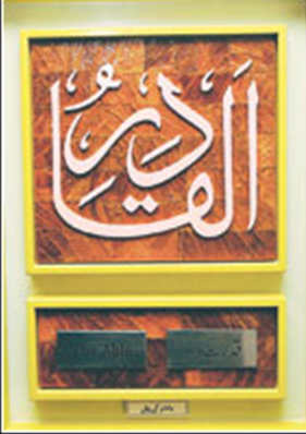 Maroof has developed these ninety-nine different works of art in ninety-nine different colour schemes, materials and combinations of materials, which makes his display rather unique and unparalleled. It took him over two years to complete this project. Not only has Maroof employed traditional art media, such as marble, metal, plastic, cloth, plaster of Paris, fibre glass et cetera, but he has also made use of media which are not traditionally used in art. Some of these are rosary beads, peacock feathers, herbs, coal, chaliya etc. They have been employed in such a manner that they aptly serve the artist’s expressive purpose. For example, Ahmed makes use of cuttings and clippings from newspapers in his frame which expresses God’s attribute of being ‘aware and all-knowing’ (al-Khabeer), for no other reason but that it perfectly highlights this particular attribute of the Almighty. In another frame focusing on God’s attribute of being ‘the hidden one’ (al-Batin), he makes use of an X-ray film to reinforce and concretise his expression. In yet another frame, he employs pieces of glass bangles which not only beautify the corresponding work but also serve to facilitate the depiction.