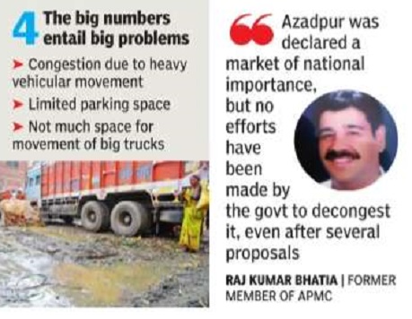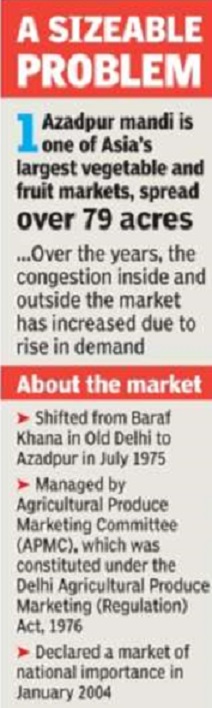 When the fruit and vegetable wholesale hub at Baraf Khana was shifted to Azadpur, around 7 km away , in 1975 in a bid to decongest Old Delhi, perhaps no one realised that the mart would outgrow its new site in just four decades. Today , the Chaudhary Hira Singh Wholesale Fruits and Vegetable Market, more popularly known as Azadpur mandi, has become an impossible place to operate out of.