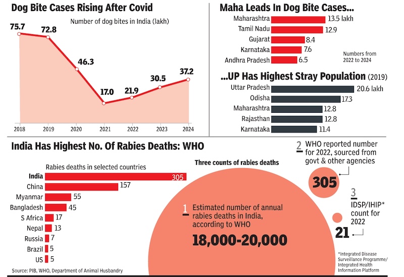 But the actual number could be much higher. If you just look at the number of rabies deaths, the figures are startling. The govt figure for rabies deaths in 2022 is just 21. WHO, using govt data and other Indian sources, says 305 died of rabies in the same year. But WHO also says that its estimate of rabies deaths in India for 2022 is actually 18,000, reports Atul Thakur .