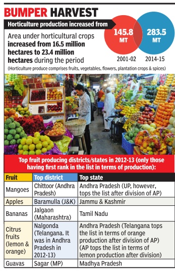 India's success in horticulture can be traced to small towns and districts. In 2012-13, Chittoor and Anantapur in Andhra Pradesh, Baramulla in Jammu and Kashmir, Nalgonda in Telangana, Sagar and Shahdol in Madhya Pradesh, Darjeeling in West Bengal, and Pune, Aurangabad, Jalgaon and Sangli in Maharashtra shone on India's fruit map.