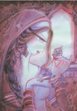 The distinctive style of Hajra’s work is the central importance of a woman’s figure. Is this a statement about women’s issues? “Not really,” she replies, “I am not trying to offer any social message, rather they serve the purpose of creating pure, refined aesthetic expressions of my inner self. My paintings reflect my ‘self’ and I concentrate on the beauty of a woman in all her glory.”