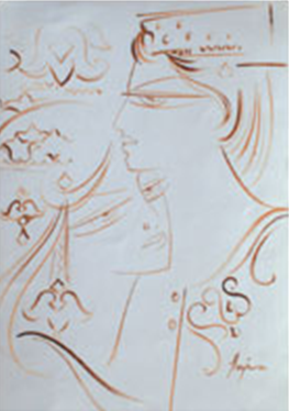 The design of the paintings is very chic and refined, and lends a very classy touch to the artist’s work. In fact Hajra narrates an interesting anecdote about one of her paintings, called ‘In Front of Lamp’. “One man liked the design of the lamp in the painting so much that he actually asked someone to make a lamp just like that for him!” A further proof of Hajra Mansur’s artistic skills is the drawing entitled ‘Couple,’ in which the right line of the woman’s face has the dual function of defining the man’s left line of the neck. The delicate balancing act performed by this single stroke, as seen by the perfection of the face as well as the neck, is a feat requiring genuine artistic talent.