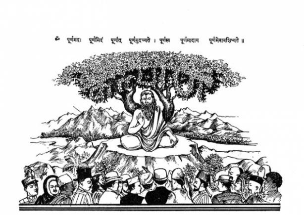 A Hindu rishi (saint) delivering a sermon to a multi-faith, multi-race audience that includes Muslims, white (British) Christians, at least one lady of African origin and an American- (‘Red’) Indian chief. The above illustration was the frontispiece of Kalyan’s special issue, Hindu Sanskriti Ank, in 1950: from the archives of the Gita Press. (Caravan)
