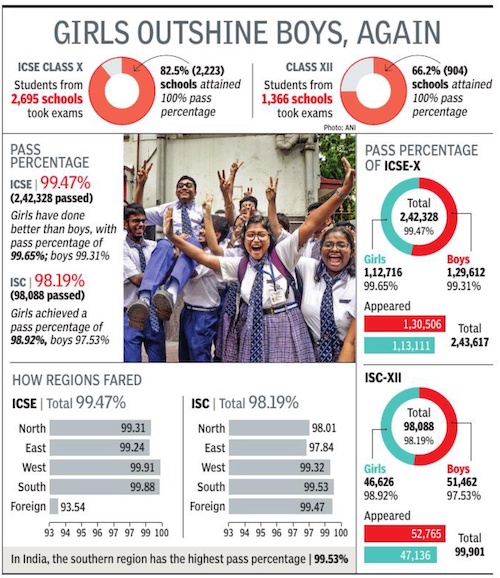 Schools abroad, particularly in Indonesia, Singapore, and Dubai, also returned exemplary performances with a 100% pass percentage in both the ICSE and ISC examinations.