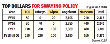 A report by investment firm CLSA shows that IT majors TCS, Wipro, Cognizant, Infosys and industry body Nasscom were collectively spending up to $2.4 million for lobbying in the US in fiscal year 2015. That number increased to $2.9 million in FY16 and then to $3.3 million in FY17 — the fiscal year when Trump assumed power. In the first three quarters of FY18, the figure is already at $3.2 million (it was $2.3 million in the same period in FY17).