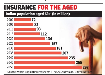 Less than two of every 100 senior citizens in India are covered under public and private health insurance. This even as the population of elderly people is growing significantly and is forecast to hit almost 300 million in around two decades. The elderly population, aged more than 60 years, is projected to constitute 18.3% of the total population in 2050, up from 7.7% in 2010, according to the United Nations. Their population will grow to 112 million by 2015 from 72 million in 2000.