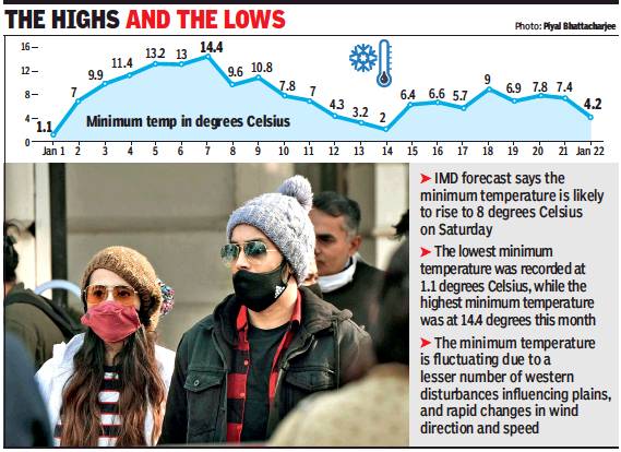 Kuldeep Srivastava, scientist at IMD and head, Regional Weather Forecasting Centre, said that a combination of factors has been causing fluctuations in minimum temperature in January. “Only one western disturbance affected the plains in January this year while six western disturbances impacted the plains last year. When the north-westerly winds blow from snow-capped western Himalayan region towards Delhi, it causes a drop in minimum temperature. However, as the wind direction changed many times, it led to sudden decrease or increase in minimum temperature.”