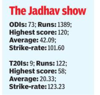 Jadhav scored 1,389 runs at an average of 42.09 with two centuries and six fifties for India in 73 ODIs. He also made 122 runs in the six innings of the nine T20 Internationals that he played.