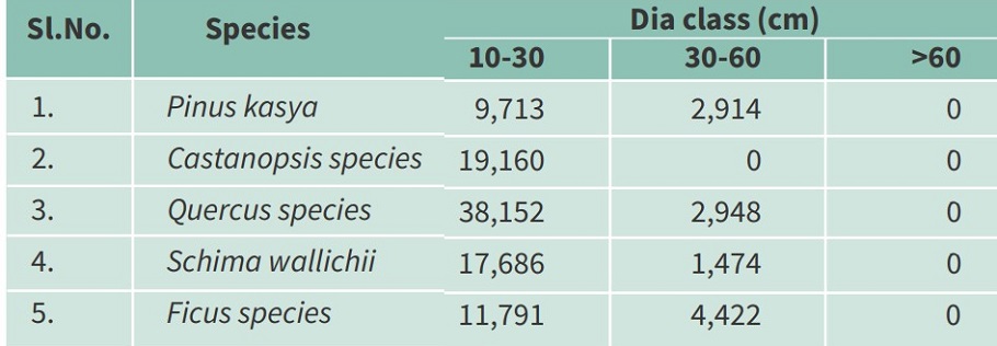 See graphic: ‘Diameter class distribution of top five species inside Recorded Forest Area in Manipur, around the year 2019