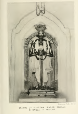 Early 1900s photograph of statue of Maratha leader, Bimbaji Bhonsla [sic], in armour.