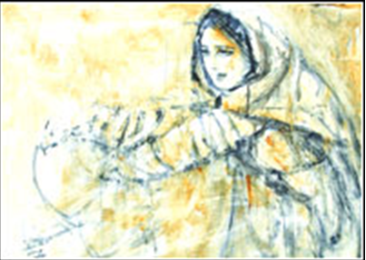 The women of Thar still retain the culture, dress and lifestyle that existed thousands of years ago and this aspect of their culture grasped the artist’s imagination with a firm grip and so began the series of one-woman compositions. The remarkable characteristic of this series of paintings is Ali’s ability to display his flexibility and command over the medium of watercolour. The theme remains the same, but even then each of the painting is unique with different colour schemes, textures and emotional content.