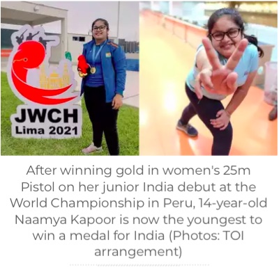 NEW DELHI: Sometime in 2017, a quiet 10-year-old kid would almost daily accompany her mother and sister to the shooting range at the Guru Harkrishan Public School in Delhi's Punjabi Bagh. The bespectacled Naamya Kapoor would diligently observe her elder sibling, Khushi, go about her routine. Naamya would hardly say a word, but the observant eyes of coach Sabir Khan were quick to scout a special talent. About five years and a pandemic later, the now 14-year-old Naamya left star India shooter Manu Bhaker behind to surprise the world of shooting with a gold medal in the girls 25m Pistol event at the ISSF Junior World Championships in Peru.