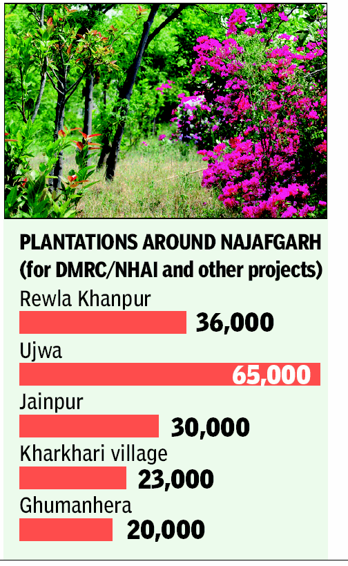 Mini forests have come up in Rewla Khanpur and other villages like Kharkhari and Ujwa in Najafgarh to compensate for the lakhs of trees felled in the city to facilitate infrastructure projects like the Metro, highways and flyovers. About 48,000 trees were cut to make way for the Delhi Metro network.