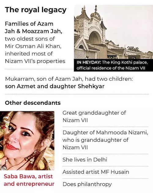 While the seventh Nizam had set up the Sahebzadas of Sarf-e-Khas Trust (it had an initial corpus of Rs 2. 5 crore) exclusively for them, it barely serves them anymore. Each member today gets a paltry sum (in some cases just Rs 20 a month) as the trust’s corpus was not managed properly and the number of claimants has increased manifold over the years. They are now fighting to revive the trust along with a share in all properties — some located in Mumbai and Mahabaleshwar as well.