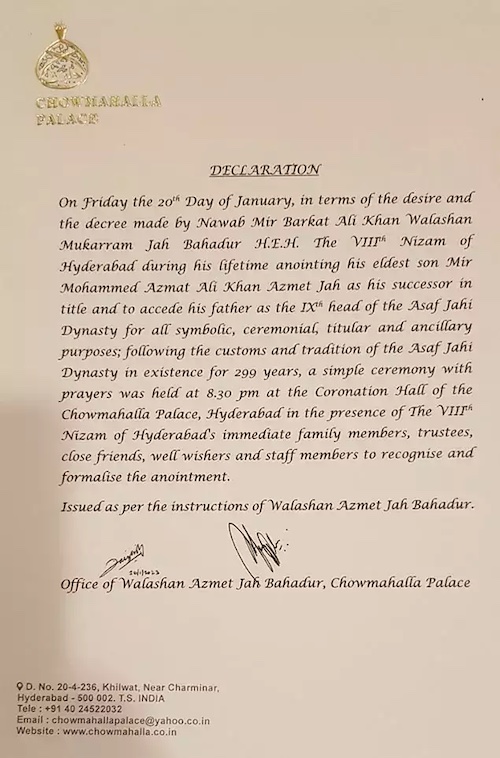 Mukarram anointed Azmet as his successor. The statement by Chowmahalla palace said, “In terms of the desire and the decree made by Nawab Mir Barkat Ali Khan Mukarram Jah Bahadur during his lifetime anointing his eldest son Azmet Jah as his successor in title and to accede his father as the IX head of the Asaf Jahi dynasty for all symbolic, ceremonial, titular and ancillary purposes, following the customs and tradition of the Asaf Jahi dynasty in existence for 299 years, a simple ceremony with prayers was held at 8.30pm [on January 20].”