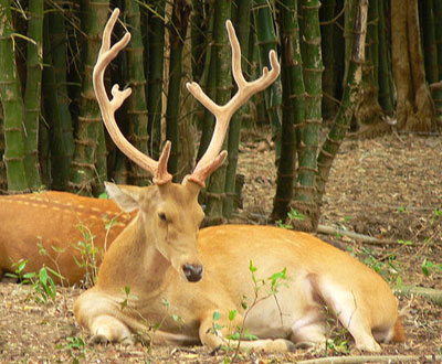 Hainan brow-antlered deer (China) : Rucervus eldii hainanus . Keibul Lamjao National Park (KLNP) : The KLNP (40 sq km) is also famous as the only floating national park in the world and Sangai is the pride of this unique habitat. It is situated near Moirang (a cultural capital of Manipur) in Bishnupur district, 45 km south of the Imphal, Manipur. This park stretches from north to south along the southeastern fringe of Loktak Lake (286 sq km at 768.5m water level). The Loktak itself is a priced Wetland of International Importance under IUCN’s Ramsar Convention, 1990 or a Ramsar Site. The KLNP is a sea of grass. More than 135 species of grass including several economically important varieties grow on the phumdi and trees are found on the Pabot, Chingjao and Toya hillocks. The park accounts for 54 species of fish, several forms of amphibians, snakes, turtles and tortoise and 150 species of birds including wintering water birds. The Sangai shares the habitat with hog deer (Axis porcinus) and wild boars (Sus scrofa).